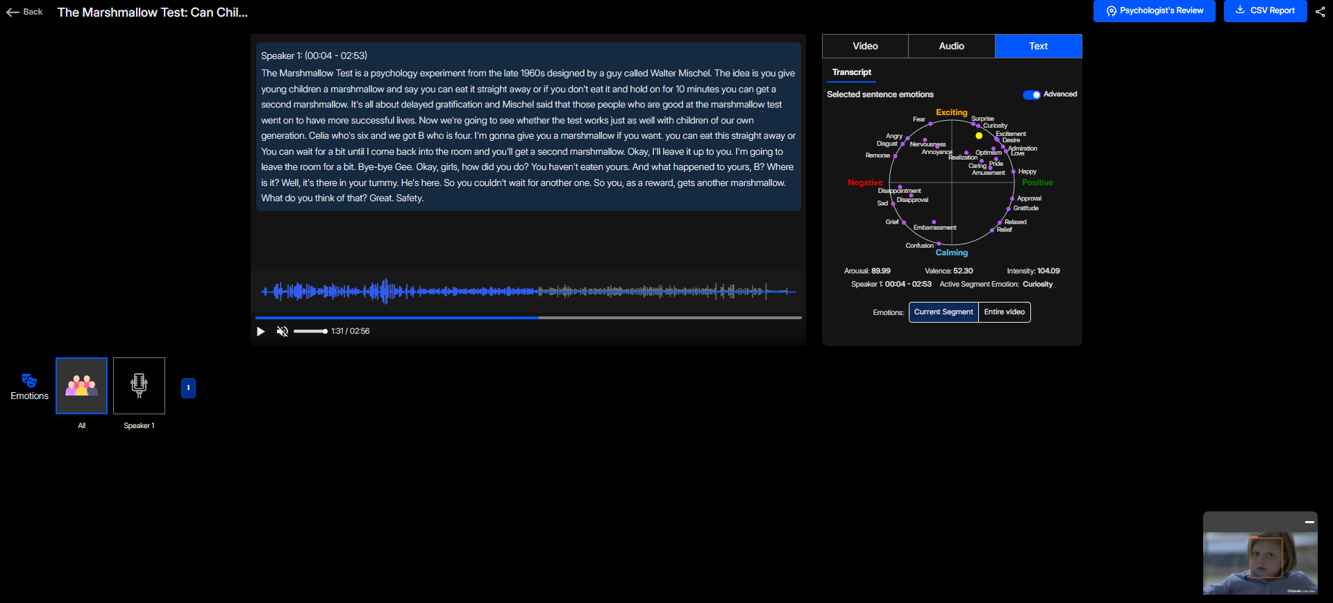 By integrating Affective AI into the analysis of this experiment, we gain more nuanced insights into children's emotional responses. Consider this video of a modern iteration of the Marshmallow Test: Imentiv AI Analysis. The AI findings for this video include: